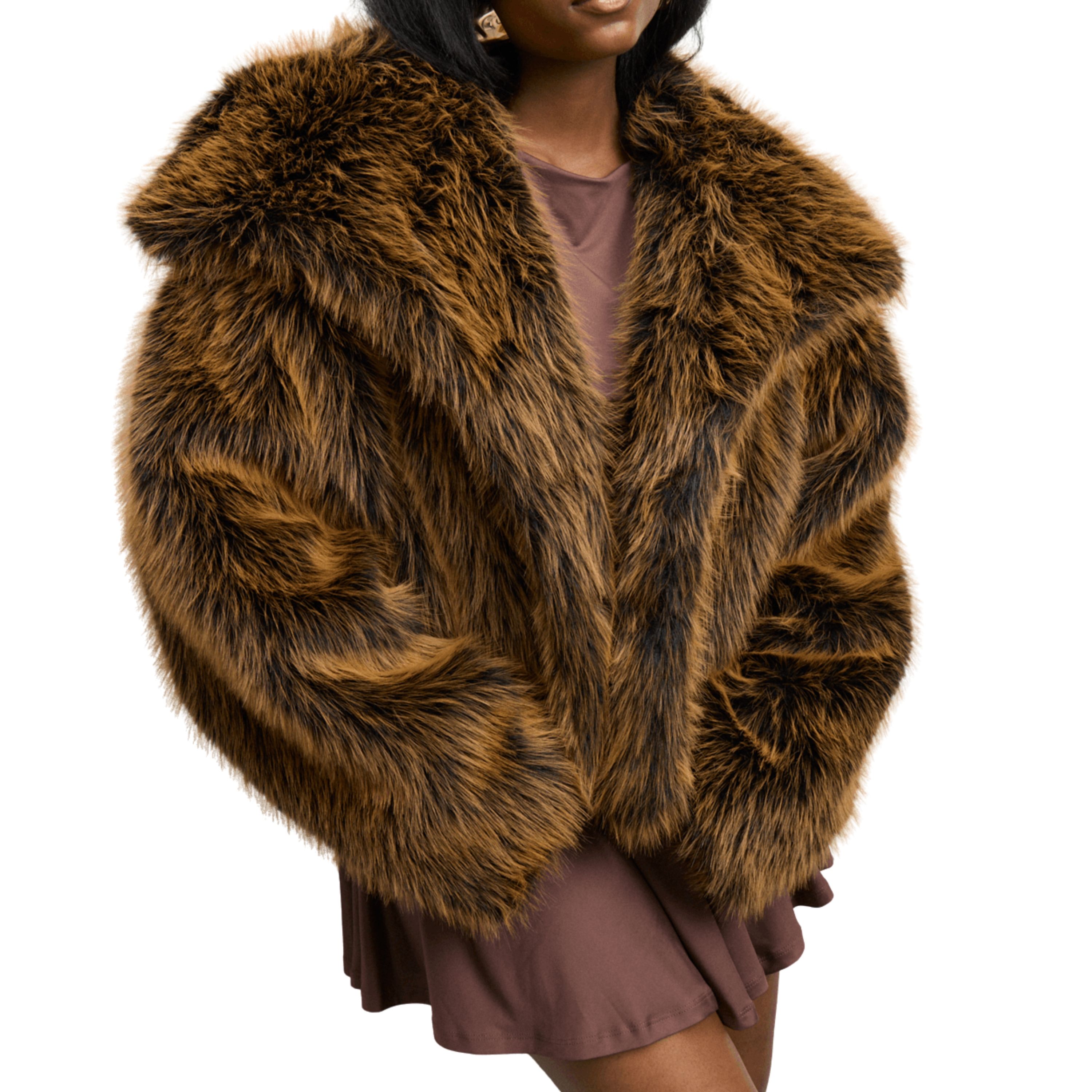 The standout piece is the plush faux-fur jacket, adding instant drama and warmth while keeping the look ultra glamorous. Accessories elevate it even further: a statement necklace, glossy makeup, and a fun pink hat that brings a playful pop of colour!